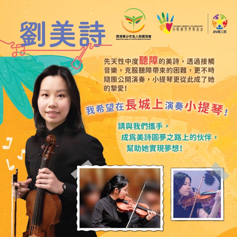 圖為香港青少年全人發展協會主席譚麗時(右二)、受助者劉美詩(中)、信願榮景慈善基金主席周志昌先生(左二)、IN義工團義工(左一及右一)於北京長城進行小提琴獨奏圓夢之旅合照。 在今年年初的時間,香港青少年全人發展協會接觸到一名患有先天性中度弱聽聽障問題的香港女生劉美詩,她分享到小時候因為聽障問題而導致在學習及日常生活上都遇到不少的不便,亦會因為自己的與其他人的與別不同而感到難過,在學習上也會感到不少的壓力。但是她幸得母親對她不斷的開解,讓她的心結得以慢慢地解開。現時的她是青年愛樂樂團團員之一,變得熱愛音樂的她是在小學五年級時首次接觸小提琴,因為當時學校內舉行的其他音樂選拔,例如樂器班等,皆被學校老師提出不適合。雖然如此,但她並沒有因此而卻步,她在機緣巧合之下,開始接觸到小提琴,而小提琴導師也在訓練時因應的需要加以矯正及講解,結合利用手機錄下訓練過程以方便瞭解並多加練習自己不足之處,加強她的耳朵對音符的靈敏度、準確性及肌肉的記憶;在久而久之練習之下,她也順利地成功演奏一首首的樂曲,小提琴更成為了她摯愛的樂器。美詩在分享時表示她十分感謝曾經教導過她的小提琴老師,包括著名指揮家吳家明老師對她的悉心指導,以及感恩呂曉一指揮的肯定,讓她加入了青年愛樂樂團成為團員之一,讓她有機會不時隨團外出演奏表演。同時,她也勉勵香港青年人不要輕言放棄,她堅信“世上無難事,只怕有心人”,終有一天可將自己的夢想達成。