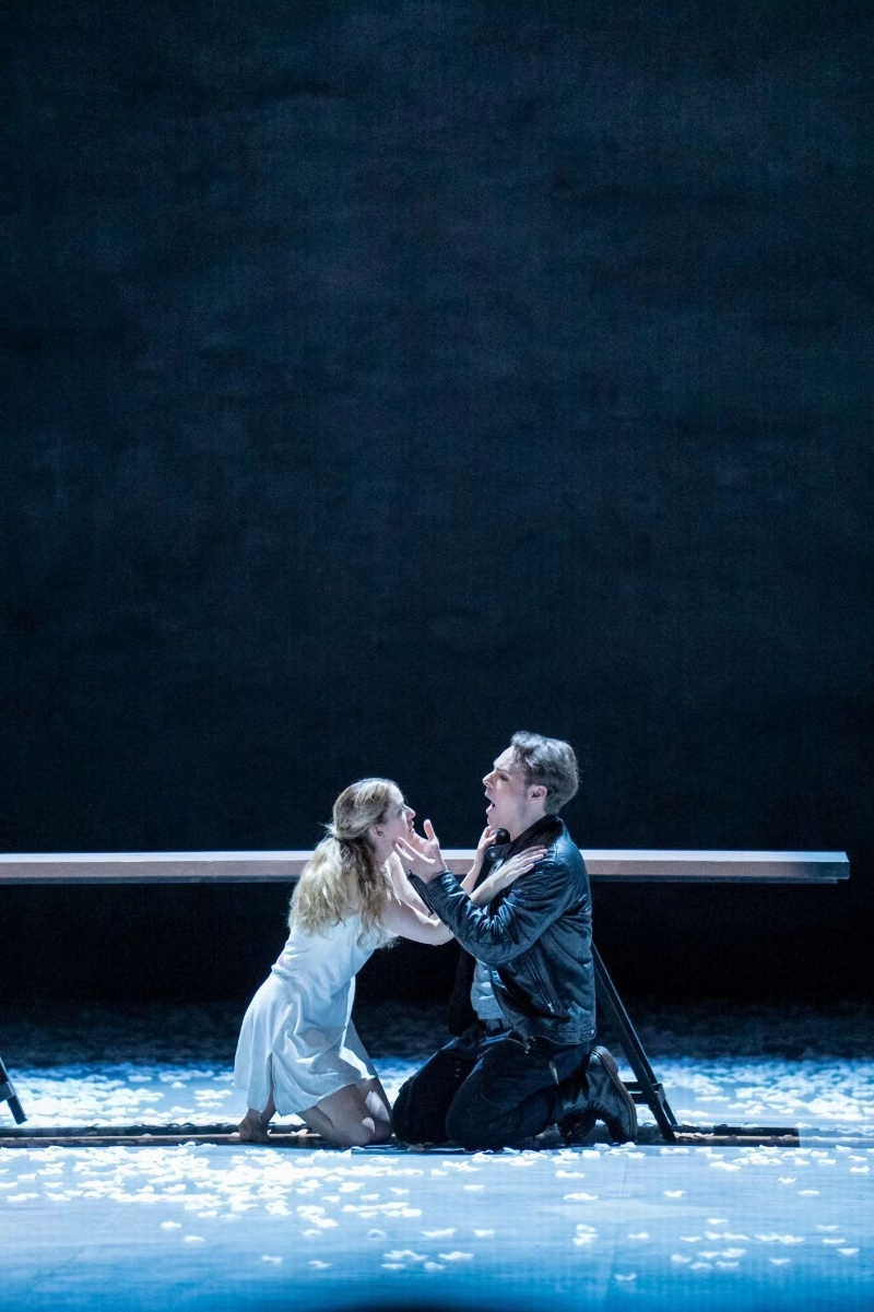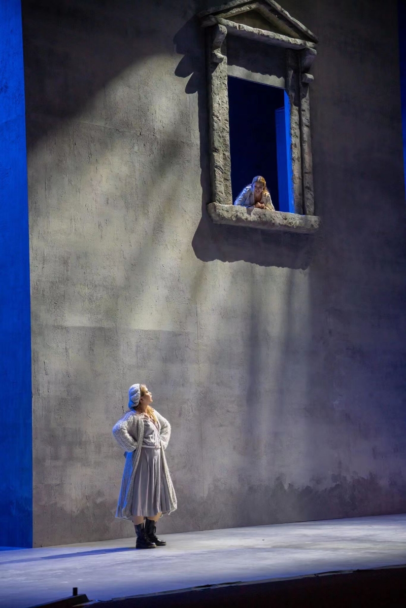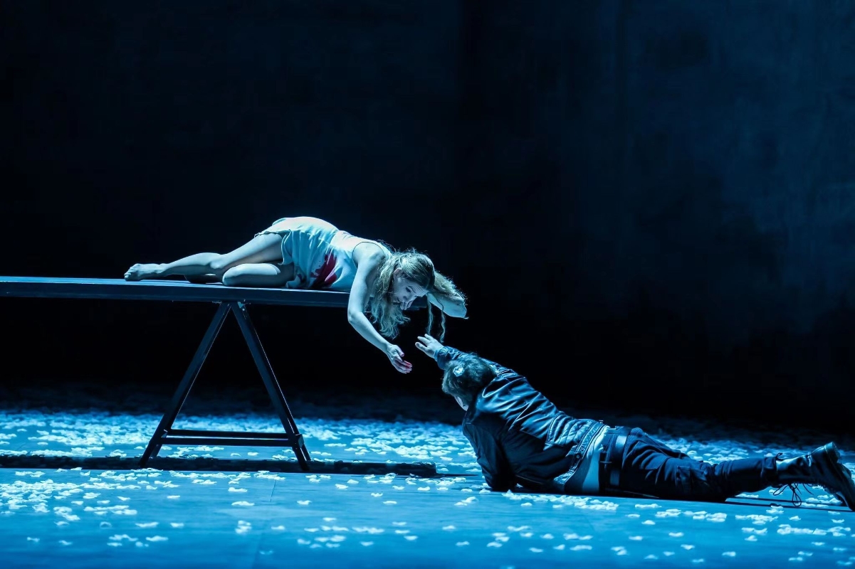 兩人殉情自殺前互表忠貞的掙扎 歌劇《羅密歐與茱麗葉》整個舞台設計是灰藍色,配合愛情悲劇的主題微妙微俏,而茱麗葉第一次假扮服毒自殺時,舞台上空飄著灰色蝴蝶伴著她的婚紗,令場面極度淒美不能自己!香港歌劇院總監莫華倫介紹說,設計師貝南是一名年輕的導演,他的華麗佈景及獨特的色彩,將觀眾直接帶入了文藝復興時期的維羅納。