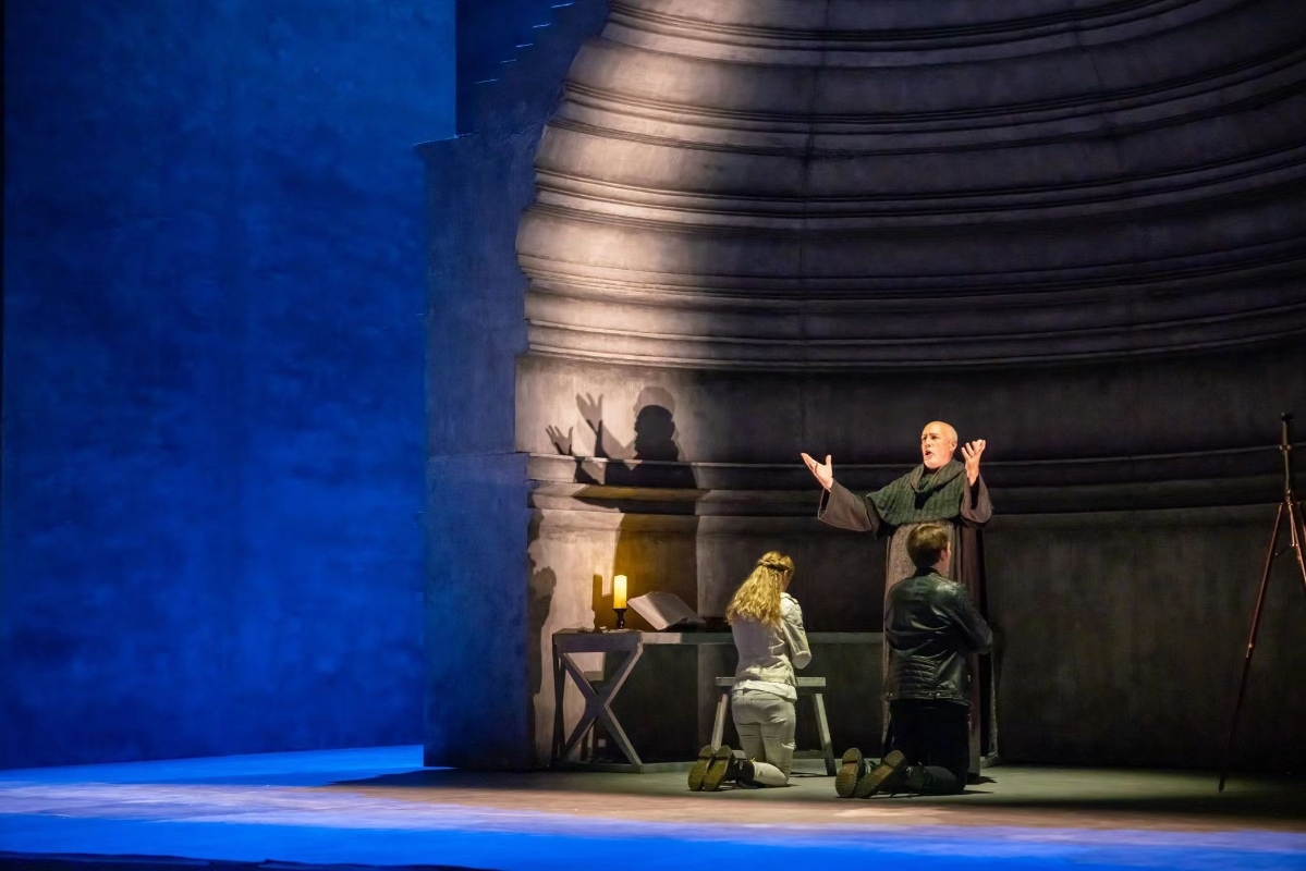 劇中神父為二人支持結婚儀式 她表演的出彩甚至都叫對手男主角“黯然失色”,其實這位羅密歐的扮演者貝廷格(Thomas Bettinger)英俊帥氣,那種典型的法國男士性感儒雅的外型,在最後一場與茱麗葉同赴黃泉自殺而亡的表演中,兩人配合十分默契,對生命的最後掙扎,奮力要與愛人最後牽手的意志,令觀眾入戲。而女主角不但唱功了得,表演也非常逼真,她用匕首插死自己,然後倒在床上翻滾抽縮,爬向愛人嚥下最後一口氣,都感覺真正的茱麗葉上身了。