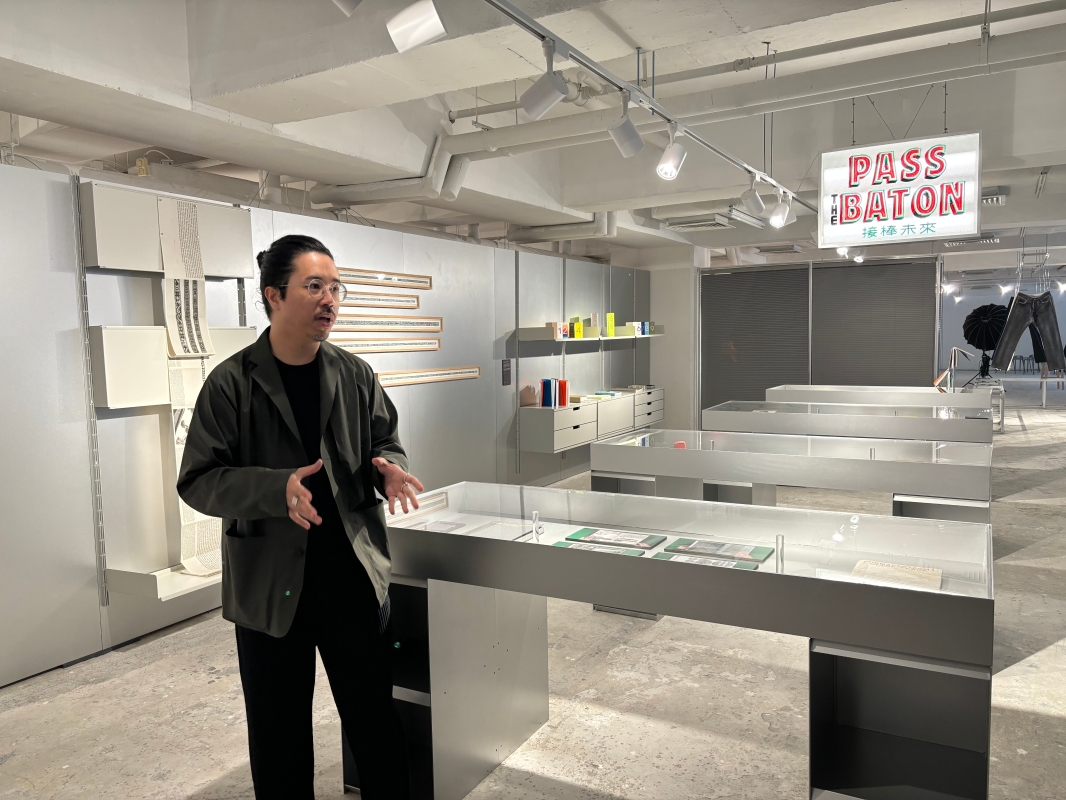 策展人梁展邦現場導賞。(香港中通社記者 黃璇攝) 如何確保知識、思想、工藝、技巧等可持續傳承下去?一些設計師有志於保存工藝、製作方法或保護我們的社區,透過合作,甚或是使用這些技能來讓它們傳承下去。是次參展的香港設計單位,包括時裝設計師Karmuel Young,他以精湛的時裝設計技巧,重新演繹經典牛仔褲系列,帶來令人意想不到的新面貌;而竹編工藝設計單位“二回”,則將傳統手藝升華,結合現代社會元素,讓大眾見識傳統工藝如何成功地順應時代巨輪流轉;舊物結集店“夕拾”,就將他們最珍視的舊物完美保留,透過舉辦展覽活動及工作坊等活動,推廣並營造一個微小而有力的小社區。