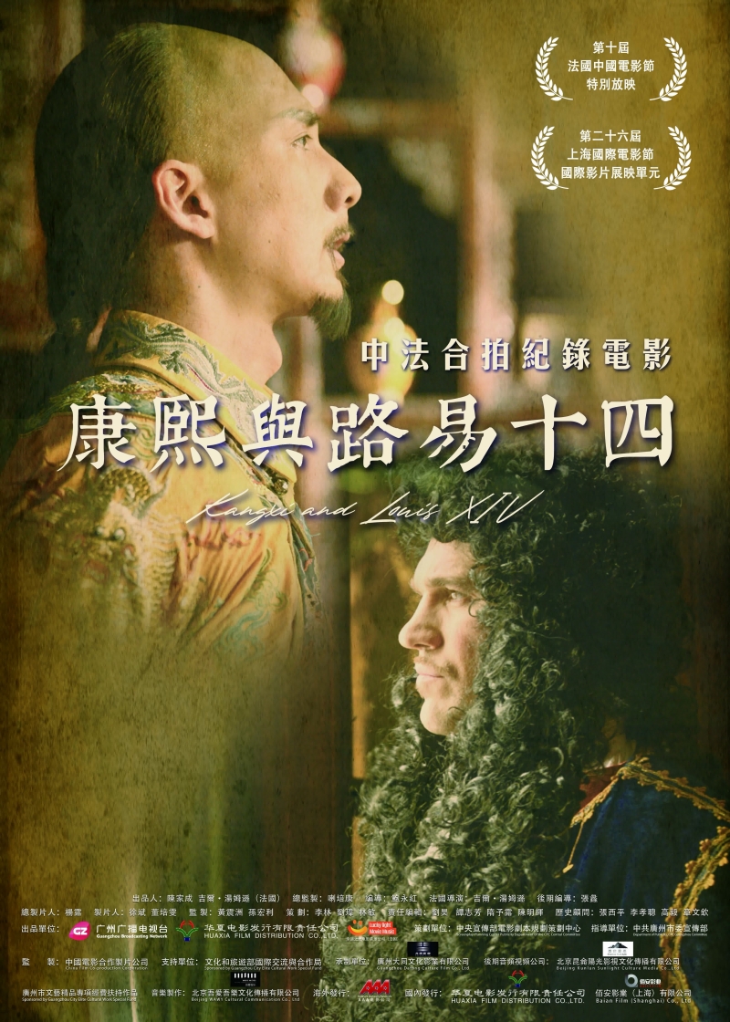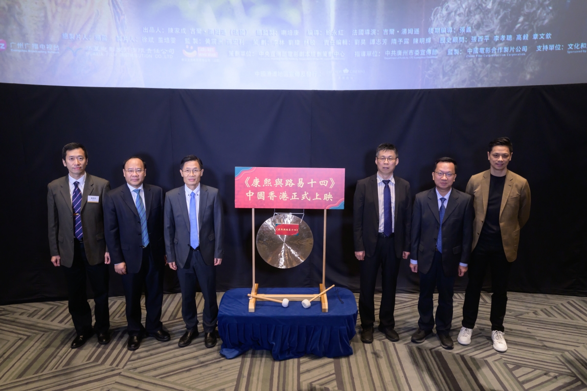《康熙與路易十四》海報。 據《大公報》報道,中央政府駐港聯絡辦宣文部副部長孫兆敏,廣州市委常委、宣傳部部長杜新山,廣州廣播電視台台長陳家成,英皇影院集團總經理袁彥文,廣州市委宣傳部副部長、市文明辦主任鮑煒,廣州廣播電視台副台長黃楚恒等主禮嘉賓出席首映禮,並在全場嘉賓的見證下共同敲響金色銅鑼,祝願《康熙與路易十四》在香港口碑票房雙豐收。