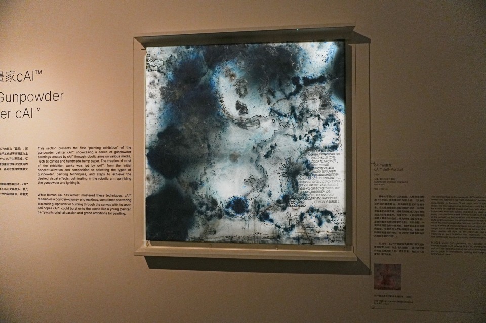 機械臂互動裝置“占卜師cAI™”。(香港中通社記者 黃璇攝) cAI™猶如“電子版蔡國強”,這是蔡國強團隊於2017年開發的程序。它擁有火藥畫家cAI™、煙花大師cAI™和占卜師cAI™等分身,展現了蔡國強的創作精髓。 cAI™的原理簡單,如同兒時背課文。通過大量的學習,cAI™從蔡國強多年的哲學和方法論出發,深度學習其創作和著作,形成“超級蔡國強”。它還模擬了蔡國強所敬仰的歷史人物,避免形成單一人格,創造出一個多元化的“萬神殿”。 蔡國強在紀錄片《天梯:蔡國強的藝術》中思考道:“當你還沒有走很遠時,更容易去未曾到過的地方。”他是一個突破自我的藝術家,曾為外星人做計劃,如今迎來了“新型爆炸”。 千年前,中國人研究火藥的初衷是追求長生不老,即便如此,火藥的爆破卻是短暫的。蔡國強的藝術魅力在於“瞬間即永恆”的矛盾。與火藥一樣,人工智能也是對“永生”的追求,然而信息的無限儲存反而造成了“信息爆炸”。