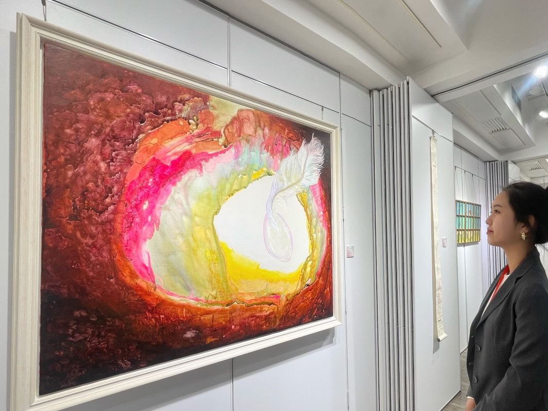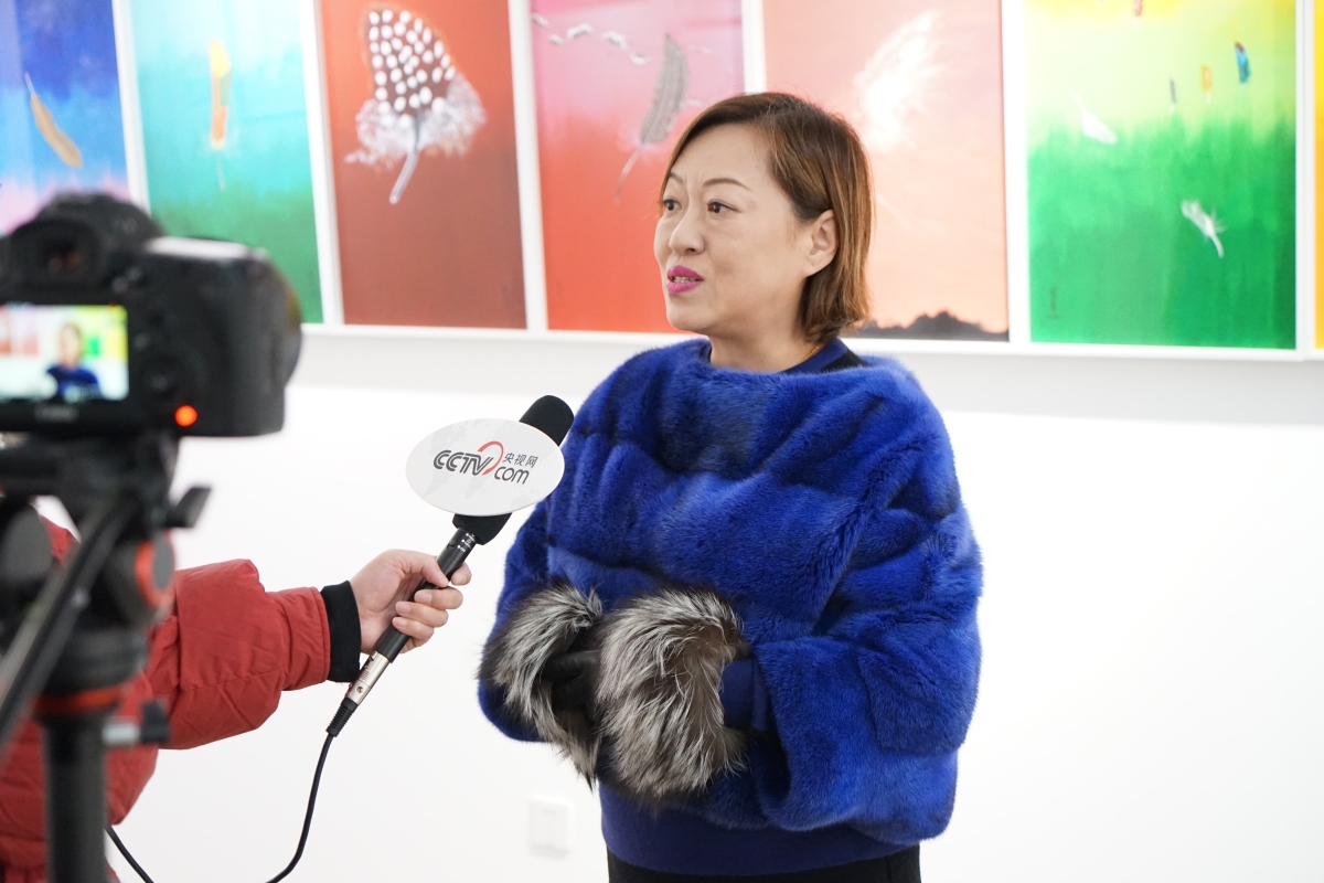 藝術家董慧女士接受記者採訪。 董慧女士是工作生活於香港的當代藝術家,她的藝術創作多以羽毛為核心意象,通過多樣媒材介質及獨特的個人語言實現自我的表達。此次展覽匯聚了藝術家董慧女士的60餘件臻選之作,較為清晰地呈現了藝術家的心路歷程和藝術脈絡。在她的作品中,羽毛不僅是一種視覺審美,更是一種心靈的寄托,是生命的化身和隱喻,是對宇宙世界的沉思默想,藝術家將羽毛這一尋常之“物”上升到形而上的精神指涉的域場,從而引發觀者走進她的美妙空靈的冥想世界,獲得超越物質現實之外審美體驗和充滿智慧哲思的靈性啟迪。 據悉,本次藝術展也是椿樹街道商會深入學習貫徹黨的二十大精神,落實“2-1-1-5-2”中國式現代化西城實踐,堅定推動文化強區建設,畫好“統戰同心圓”,引導街道商會單位、統戰人士、巾幗代表等投身椿樹經濟社會發展,加快琉璃廠優質文化資源提升的特色活動。作為椿樹街道商會成員單位,一得閣也將與藝術家聯合,為本次展覽中注入愛心公益元素,在後續展覽過程中,開展“‘椿’鋒聚力 新‘羽’送福”迎新春文化體驗活動,邀請椿樹地區各民族青少年、歸僑僑眷代表等,在藝術家指導之下,共同制作羽毛“福”字,感受多元藝術之美,共迎中華傳統佳節,共繪“統戰同心圓”。