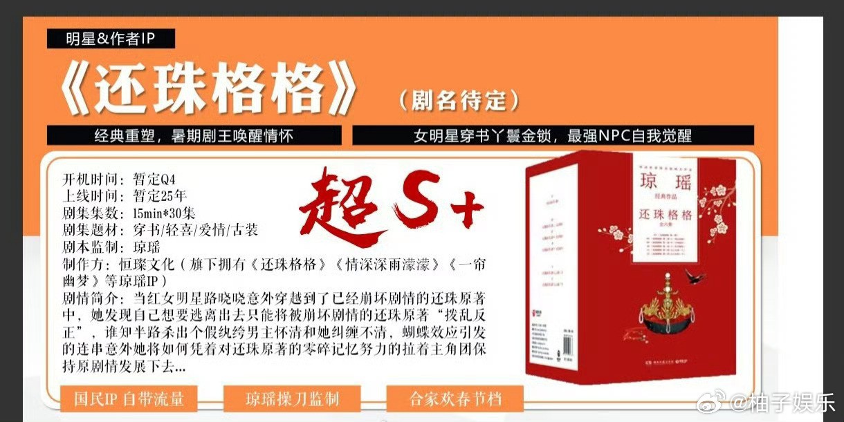 30集超S+微短劇《還珠》現已備案,根據知名作家瓊瑤小說《還珠格格》改編。(圖源:微博) 該短劇大致劇情是當紅女明星意外穿越到了已經“崩壞”劇情的《還珠格格》原著中所發生的故事。 報道稱,這部短劇暫定今年上線。 中國影視行業的“S+”指超級劇,即製作經費充足、團隊水平高。 根據瓊瑤同名小說改編的清裝宮廷劇《還珠格格》是中國電視劇發展史上一座里程碑。該劇自第一部1998年首播以來,至今不斷重播,連續登頂實時收視全國第一。2011年,這部瓊瑤劇的翻拍版《新還珠格格》播出,雖無法媲美老版輝煌,但也取得了不錯的收視成績。 微短劇近年發展勢頭迅猛。近日發布的《2024年中國微短劇產業研究報告》顯示,2024年中國微短劇市場規模已達到505億元人民幣,首次超過電影票房規模。(完) 【編輯:黃璇】