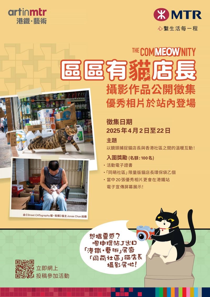 香港新聞網4月8日電 “同萌社區THE COMMEOWNITY”貓店長.窩心攝影展正於港鐵中環站J出口的“港鐵‧藝術”展廊展出。為延續展覽所推動的社區探索精神,港鐵公司現舉辦“區區有貓店長.攝影作品公開徵集”,邀請全港市民分享社區貓店長的日常點滴,並將精選20份作品於5月期間在港鐵站內展出。