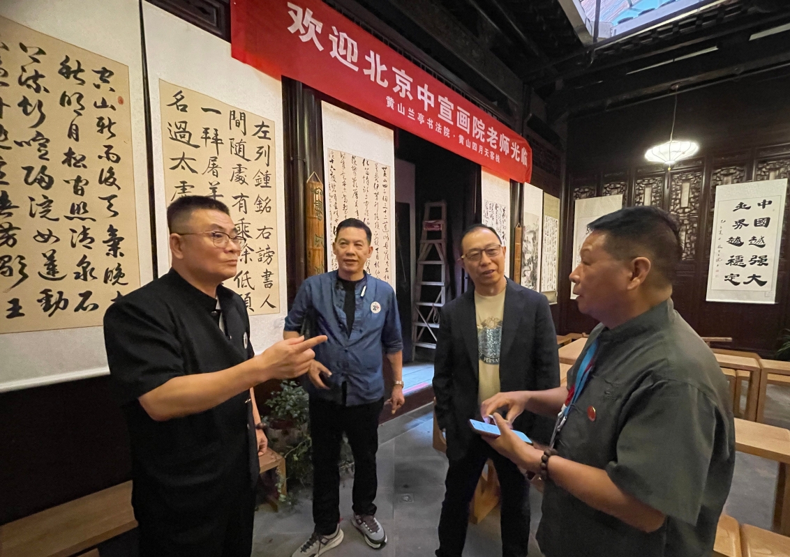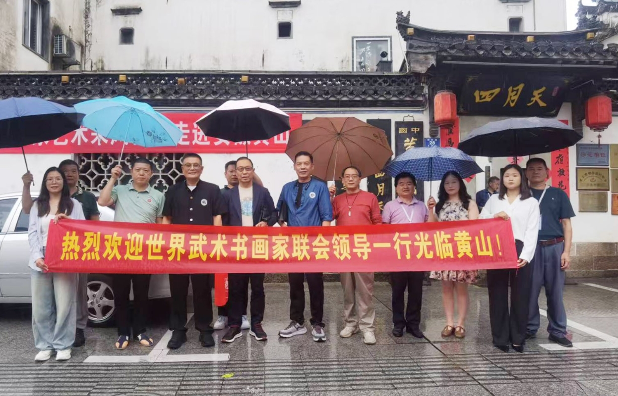 世界武術書畫家聯會主席、中宣盛世國際書畫院客座教授高國雄(前排左三)、世界武術書畫家聯會創會會長、中國功夫書法研究院榮譽院長盧文快(左四),世界武術書畫家聯會副主席、粵港澳大灣區書畫協會榮譽會長李玉騰(左五)等嘉賓抵達黃山參加活動。