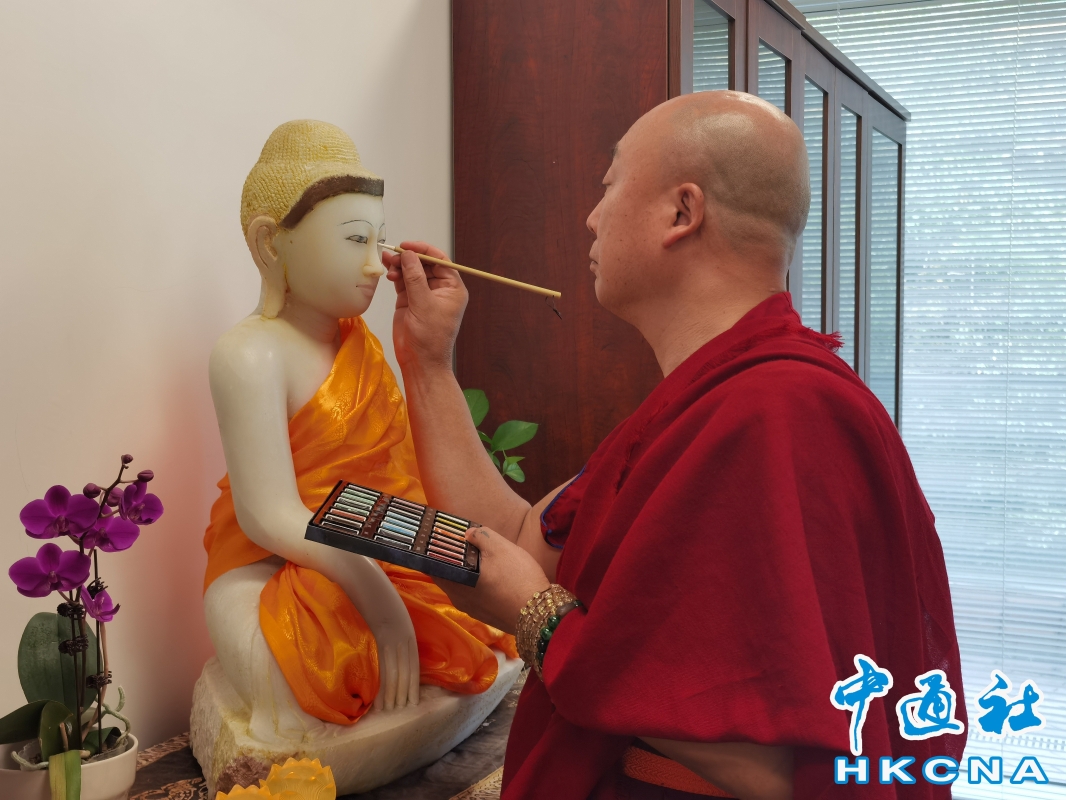6月18日,青海熱貢唐卡大師羅藏旦巴在香港大學舉辦講座,並現場作畫,與學生交流AI能否取代唐卡畫師。(香港中通社記者 譚暢攝) 同時,畫師亦需遵循嚴格的圖像儀軌。唐卡造型必須按照《佛說造像量度經》造像典籍的規範,按“三疏一經”工巧明的詳細論述,上千尊造像的身軀各部位、各器官的造型尺度比例等,落筆不可有偏差。一幅唐卡短則用時半年,長則需要十餘年,才得以完成。 在羅藏旦巴看來,AI沒有信仰。由AI繪出的畫,好似元素的拼貼組合,可對唐卡而言,拼貼出的內容即使錯位一寸,其寓意都天差地別,有凡聖之分。此外,繪製唐卡時需要用到天然礦物原料,在繪製時亦是將山河精魄寄託其中;而AI生產出的畫作縱使顏色模型再精準,也終究是沒有重量的光子。 不過,AI的算法同樣也可以為唐卡線稿校正毫釐之間的偏差,以光譜色彩將礦物的顏色保留千年。羅藏旦巴期望,AI可以為唐卡的繪畫帶來便利,但唐卡薪火相傳的本質,不應被AI所掩埋。 隨著科技發展,人們越來越多地使用電子平板、電子筆作畫。羅藏旦巴說,這自然會對藝術的傳承有影響,他亦會感到有些擔心。不過,也正因此,他加快了推廣的步伐,是次來香港做講座,正是想讓更多年輕人了解、喜歡唐卡藝術,期望學生們更好地以修行的方式,完成一幅唐卡。 羅藏旦巴亦現場對唐卡作品進行裝裱,並與參與講座的聽眾互動,科普唐卡知識。作為西藏佛教中特有的繪畫藝術,唐卡是一種彩緞織物裝裱成的卷軸畫,其並非以紙張進行繪製,而是採用打磨平滑的棉布。有聽眾好奇地撫摸尚未裝裱的作品邊角,感受唐卡的質感,由衷欣賞這門藝術的靈魂與能量。(完) 【編輯:黃璇】