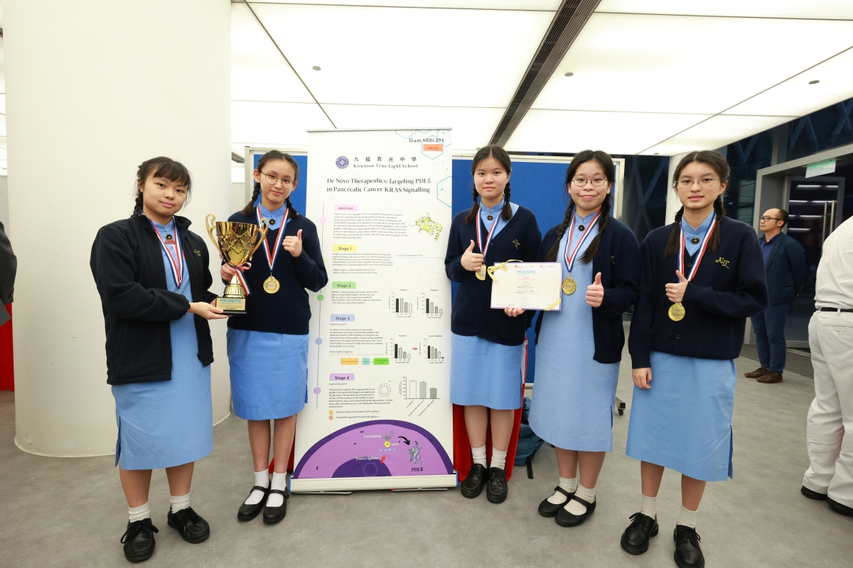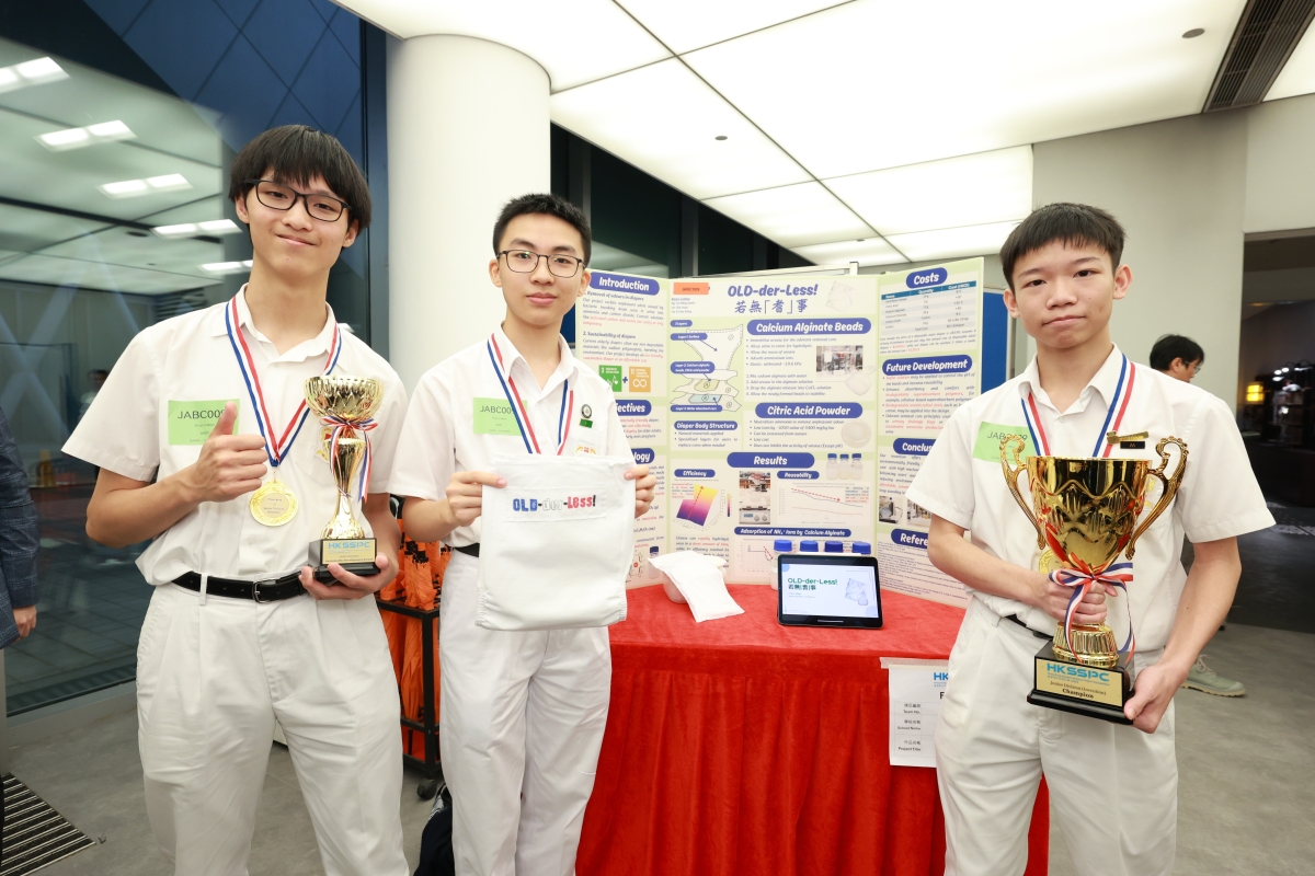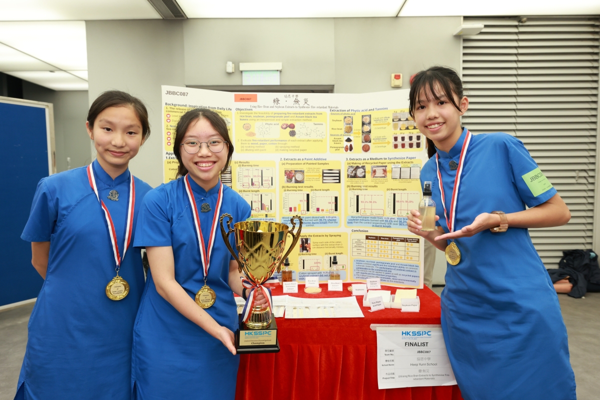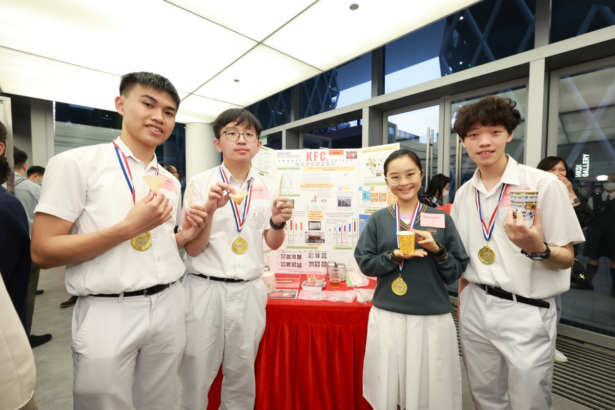 決賽上20支精英隊伍均表現出色,作品展現無限創意,各具特色,令人印象深刻。整體水平之高令人驚歎,優異表現備受評審團肯定。其中4支隊伍贏得評審團的一致青睞,摘下比賽桂冠。初中組(發明品)冠軍由英皇書院的隊伍以“若無『耆』事”奪得,作品利用海藻製作微膠囊,並加入脲酶,配合檸檬酸作出多層過濾,發明出新一代可重用成人尿片,有助分解尿素產生的氨,以減少對使用者皮膚的刺激及解決異味問題,從而提昇長者生活質素,同時鼓勵大眾支持環保;而協恩中學隊伍則以“糠.無災”贏得初中組(研究項目)冠軍,研究旨在嘗試各種天然植物原材料,如石榴皮、黑茶、米糠及黃豆中的提取物-植酸及鞣質,測試其製造阻燃劑的可行性,望能研發出對人體較為友善的阻燃劑。 高中組(發明品)冠軍來自迦密柏雨中學團隊發明的“特級抗菌即食即棄餐具”,此作品由紅茶菌所製成,並透過生物工程技術,從甲殼類生物的外殼提取殼聚糖塗層,再塗覆於生成的餐具之上,成為一款集耐熱、耐冷、抗菌、不含致癌物、可降解於一身的產品。 九龍真光中學的隊伍利用諾貝爾得獎的人工智能工具 RFDiffusion,產生出能夠抑制癌症訊號通路中 KRAS-PDE 相互作用的多(左月右太),透過融合肽及 PEI 轉染技術策略,成功發現此治療方法能有效提高肺癌和胰臟癌的抑制效果,最終憑“抑制胰臟癌及肺癌活性的多肽新策略”成為高中組(研究項目)冠軍。