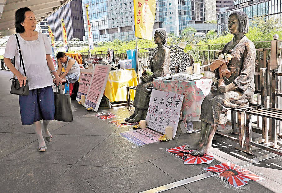 香港中環天橋的“慰安婦”紀念像,僅存在4年便被移除。 圖源:文匯報 在世界各國與地區的民間組織推動下,2016年全球紀念“慰安婦”倡議達到最高潮。上海市於當年10月揭幕中國首座中韓“慰安婦”受害者銅像並設立了中國“慰安婦”歷史博物館。隨後美國、加拿大、澳洲等地也陸續設立“慰安婦”紀念碑,引發日本政府外交抗議。2017年7月7日保釣行動委員會於日本駐香港總領事館所在的交易廣場對開的中環行人天橋上設立了一座“慰安婦”雕像,以抗議日本前首相安倍晉三的“慰安婦”右翼政策。事件引發日本駐港總領事館抗議,並要求特區政府拆除。2021年7月該雕像經由設立團體自行拆除,《讀賣新聞》引述與團體關係者消息稱,“因為設置時沒有申請,警方要求撤除。”(完) 【編輯:王少喆】
