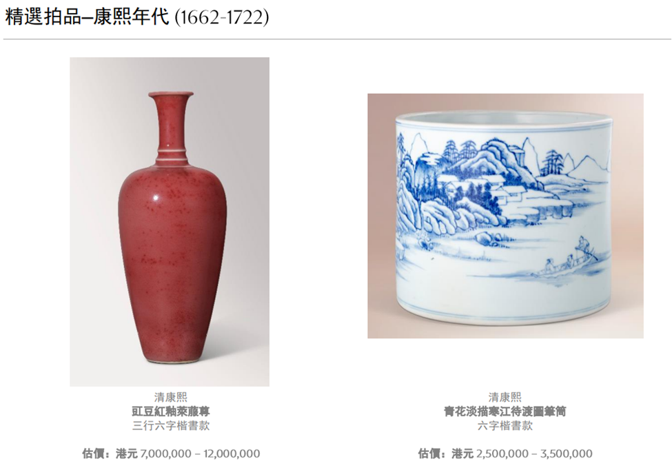 領拍珍瓷包括清康熙豇豆紅釉萊菔尊(估價:港元7,000,000 – 12,000,000)、清雍正洋彩過枝虞美人盌(估價:港元6,000,000 – 10,000,000)、明宣德青花石榴纏枝蓮紋蓮子盌(估價:港元3,800,000-5,550,000)、清康熙青花淡描寒江待渡圖筆筒(估價:港元2,500,000 – 3,500,000)等。 區氏瓷器珍藏堪稱全球最全面的私人藏瓷之一,如今載譽重臨佳士得拍場,再次印證佳士得作為顯赫珍藏拍賣翹楚的地位。繼去年的“區百齡珍藏:首拍”專場拍賣,是次第二部分專場拍賣部分收益同樣將撥捐予區百齡慈善基金會,繼續發揚區百齡“飲水思源”的慷慨精神,造福社會。(完) 【編輯:黃璇】