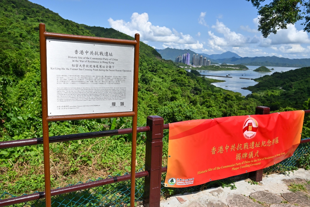 圖為設於馬鞍山郊野公園內的新界西貢企嶺下西沙路的紀念牌匾。(政府新聞處圖片) 豎立紀念牌匾的地點位於公園內的企嶺下西沙路,是抗戰期間“秘密大營救”的重要渡海據點,抗日文化人士輾轉抵達企嶺下海灣,渡海撤離香港。 揭牌儀式由特區政府環境及生態局局長謝展寰、中央人民政府駐香港特別行政區聯絡辦公室新界工作部副部長王卉等主禮。謝展寰表示,揭牌儀式意義非凡,既是紀念抗戰人士無懼犧牲、保家衞國的精神,亦讓更多市民及下一代認識這段重要歷史,從中領略歷史智慧和民族精神。 漁護署早前將位於紅花嶺郊野公園的蓮麻坑鉛礦洞活化成開放式博物館,製作介紹紅花嶺抗日歷史的短片,並設立獅子山戰地遺跡徑及松林砲台歷史徑等,未來將繼續透過宣傳教育,深化市民對郊野公園抗戰遺址的認識,讓更多人認識和關注這段珍貴歷史,從而理解抗戰勝利的重大意義。(完) 【編輯:黃璇】
