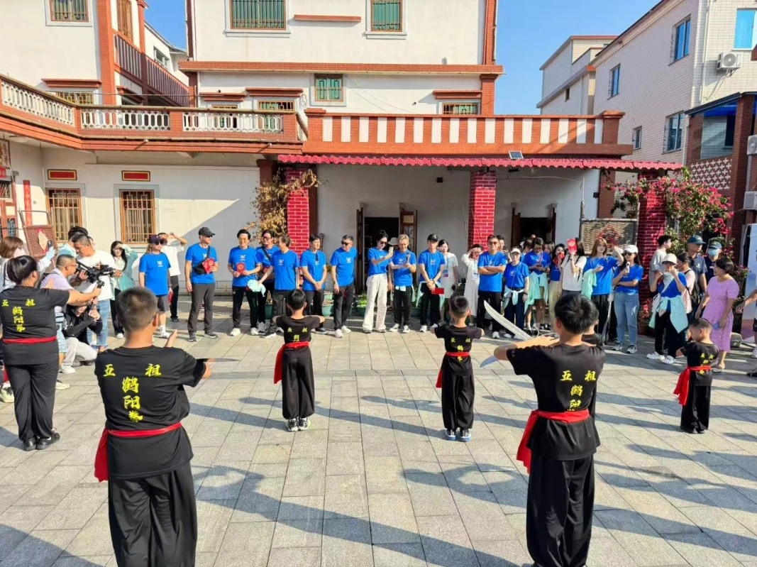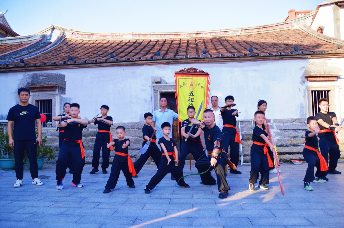 表演在古鎮古厝石埕進行,小拳師們身著傳統練功服精神抖擻,展現出五祖鶴陽拳的剛柔并濟之美。