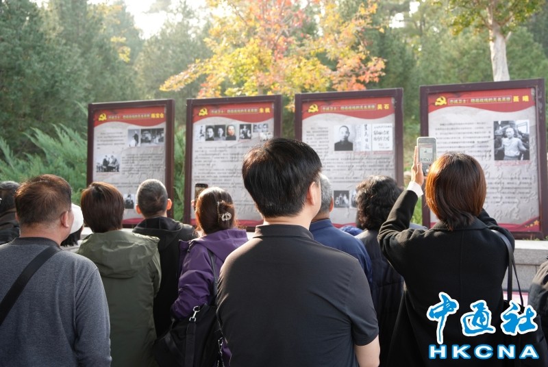 10月25日,北京西山無名英雄紀念廣場。民眾在瞻仰陳寶倉、朱楓、吳石、聶曦四位烈士事跡。 香港中通社圖片 “最讓我感動的就是吳石將軍等烈士慷慨赴死的氣概。他們甘願為了新中國的未來而犧牲。除了這四位烈士之外,紀念碑上的這麼多姓名,也都是一去不回的英雄。”劉慧蘭說。 廣場南側設有服務點,提供可以循環利用的鮮花和留言册,以便民眾憑悼烈士。一位工作人員說:“今天第一本留言册已經寫滿了,剛剛換上新的。這兩天來參觀的人非常多。” 簇簇鮮花中間,插著一張印有“10月25日台灣光復紀念日”的紅底卡片,“致敬無名英雄”字樣寫在空隙處。