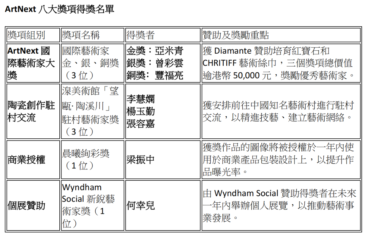 文化體育及旅遊局局長羅淑佩 (左)與 ArtNext 國際藝術家金獎得主亞米青合照。圖源:主辦方 大會於開幕典禮上,由重量級嘉賓揭曉並頒發多個重要獎項。ArtNext Fair 堅守扶植藝術家的使命,各獎項得獎者名單如下:
