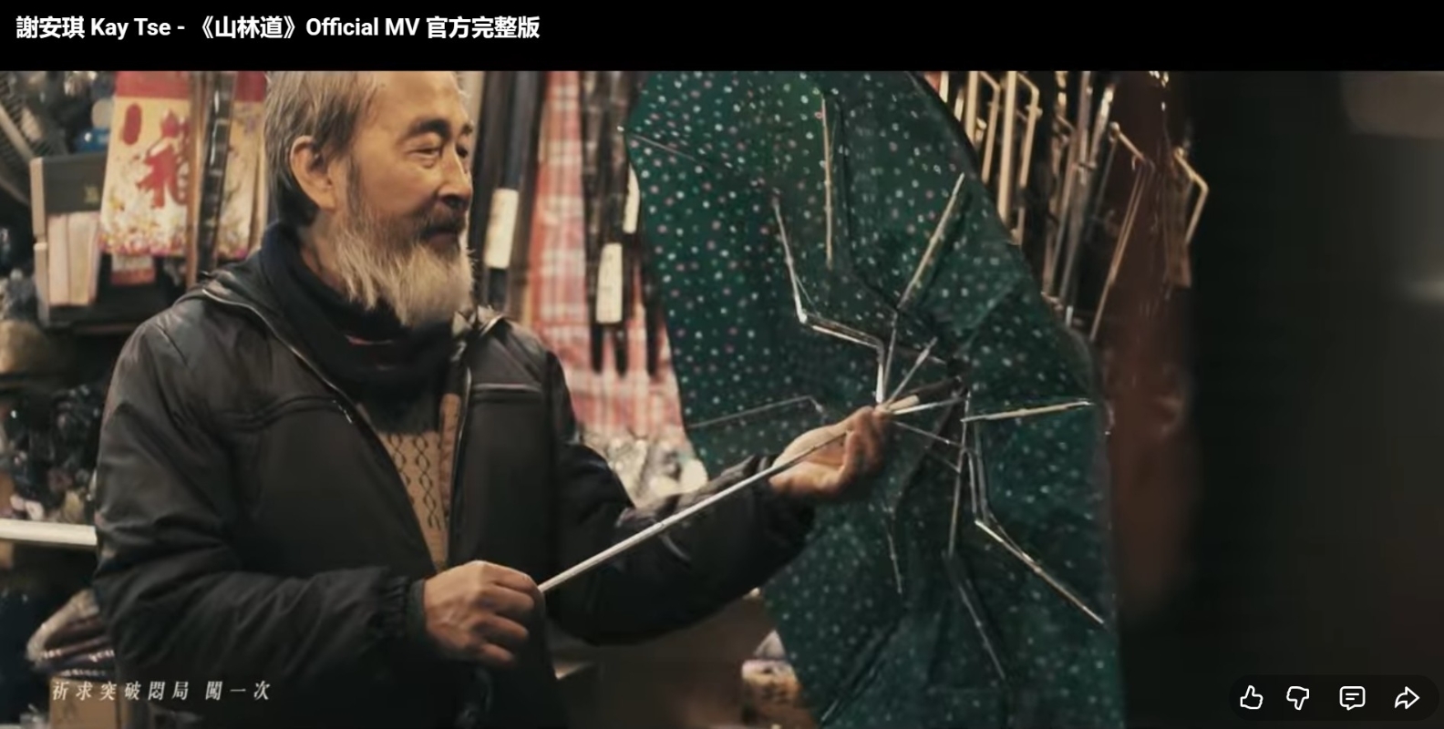 歌手謝安琪的《山林道》MV中,威哥第一位出場,撐開雨傘,字幕寫著:“回憶和情懷比搵食更重要”。(YouTube截圖)