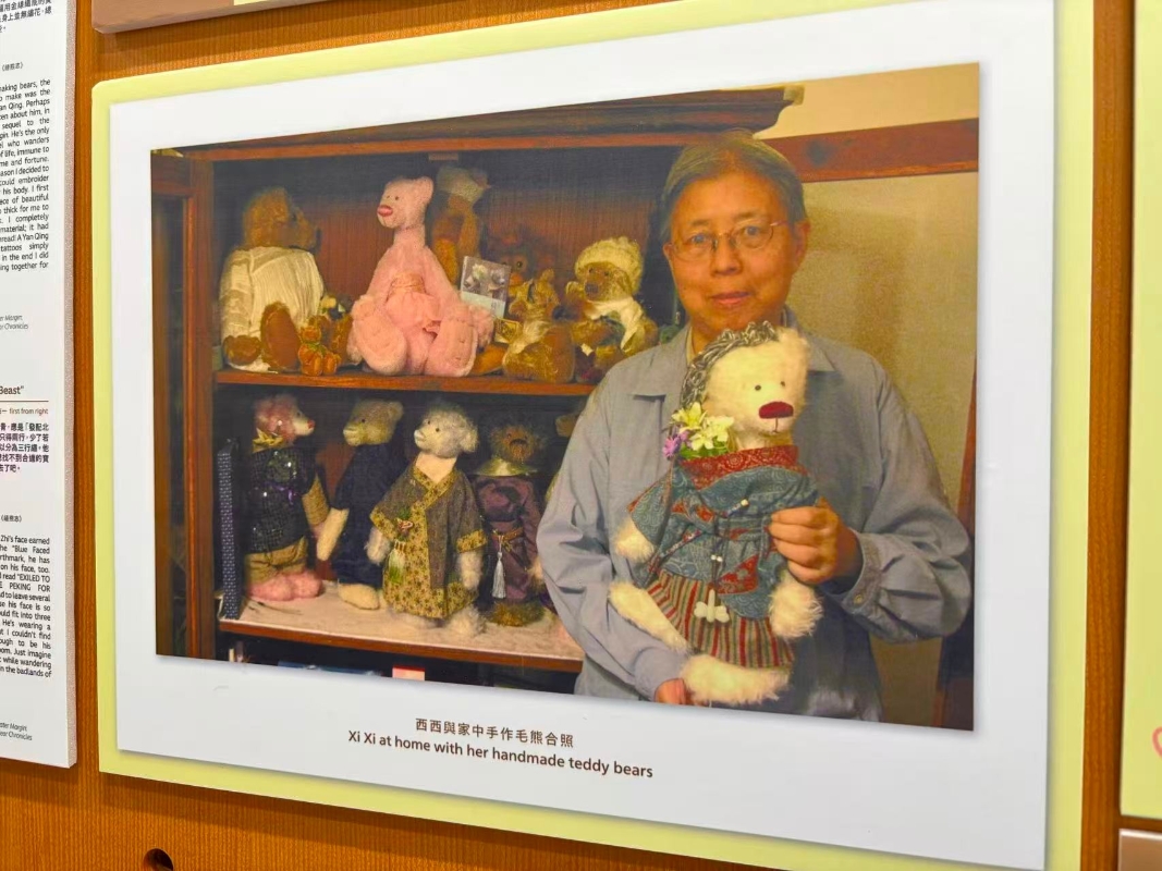 “西西空間”1:1重現西西故居客廳。(香港中通社記者 黃璇攝) 展覽的主題“從縫熊開始”別具巧思。1989年,西西因乳癌手術,右手逐漸失靈,於是改用左手寫作,更開始自學縫製毛熊。第一隻自製布偶叫“黃飛熊”,曾陪她飛往世界各地。她說,寫作未必有進步,但縫熊可以不斷突破自己。後來,她更跟老師正式學習。展品除了黃飛熊,還有“水滸英雄”、包拯、靈長目動物,甚至以弗蘭肯斯坦造型創作的毛熊,連結着她的人格與想像。