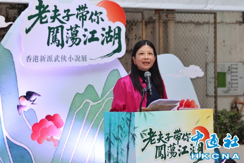 圖為香港文學舘舘長羅光萍致辭。 香港中通社記者 謝光磊 攝 香港文學舘舘長羅光萍致辭表示,新派武俠小說秉承“俠之大者,為國為民”的精神底蘊,融匯中華優秀傳統文化與現代價值,與愛國主義、培育家國情懷的時代要求高度契合。展覽以香港家喻戶曉的文化語言“老夫子”為引,希望公眾能在輕鬆趣味的觀展過程中,逐步領略香港新派武俠小說的發展脈絡、文本特色及名家風采。
