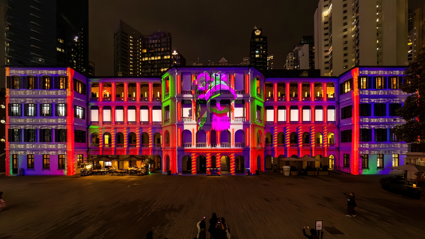 “綻放大館2026”2月6日至2月22日回歸中環大館。(香港中通社記者 黃璇攝) 這次活動將會利用全球領先的立體光雕投影技術,每年為前中區警署的古蹟建築外牆賦予不同的面貌。五周年作品《流光幻夢》將擴大其製作規模,創作出揉合音樂、舞蹈及流行文化,如萬花筒般的色彩,回顧上世紀70年代的香港文化。 《流光幻夢》講述⼀名少年在半夢半醒之際,踏上⼀段奇幻旅程。透過六個篇章,他穿梭於⼀個⼜⼀個超現實場景,邂逅⼀位神秘女⼦。⼆⼈展開⼀段電影般的浪漫故事,在電⾞、咖啡店與霓虹街道下,遊⾛於現實與虛幻之間。隨後夢境轉暗,少年陷入無⽌境的機械化⼯作循環,直⾄他憶起愛⼈,使他掙脫職場束縛。男主⾓與愛⼈重逢時,四周瞬間爆發出⼀場結合的⼠⾼元素的功夫對決——70年代意象紛紛湧現……⼆⼈在倒置的汽⾞之間翩翩起舞,在流光溢彩中迎接新年。