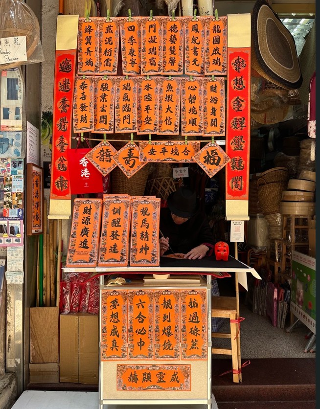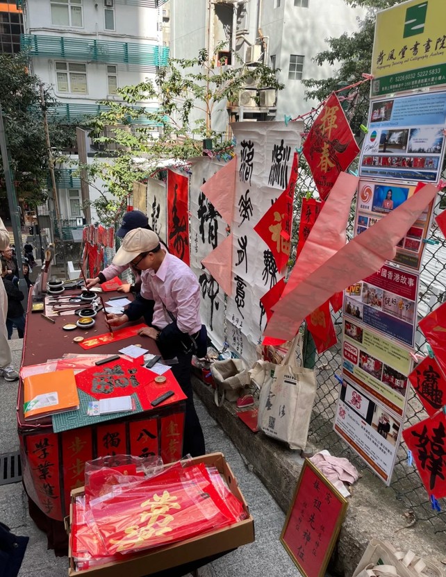 每逢歲晚,上環樓梯街都會有即席揮毫的字畫檔攤。(香港中通社記者 黃璇攝) 在水坑口街經營逾六十年的朱榮記雜貨舖門前,“寫揮春的大哥”則以自家設計、親筆繪畫的原創揮春見稱,堅持本地印刷,不僅有常見吉語,也設計了“百福駢臻”、“門凝瑞靄”及特別合體字,令老字號平添幾分新意。