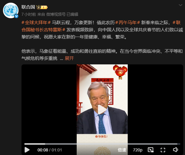 圖片來源:聯合國社媒截圖 他表示,馬象徵著能量、成功和勇往直前的精神。在當今世界面臨衝突、不平等和氣候危機等多重挑戰的背景下,人類社會迫切需要這些品質。 古特雷斯感謝中國和中國人民對聯合國、多邊主義和全球團結事業的大力支持。他重申,聯合國將繼續致力推動人人享有和平、尊嚴和可持續發展的共同目標,並呼籲國際社會齊心協力,建設一個更安全、更包容的未來。(完) 【編輯:林曉惠】