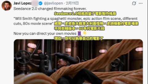 香港新聞網2月12日電(文 紀東)近日,字節跳動毫無預兆地扔出了一個“王炸”——新一代視頻生成模型Seedance 2.0。雖然初期只是在一定範圍內測試,但仍快速火出圈,在影視行業掀起軒然大波。有影視從業者體驗後驚嘆,傳統影視工業鏈條中導演、攝影師、剪輯師、配樂師等崗位,正被這一模型“打包壓縮”。外媒形容它是“DeepSeek時刻”再現。