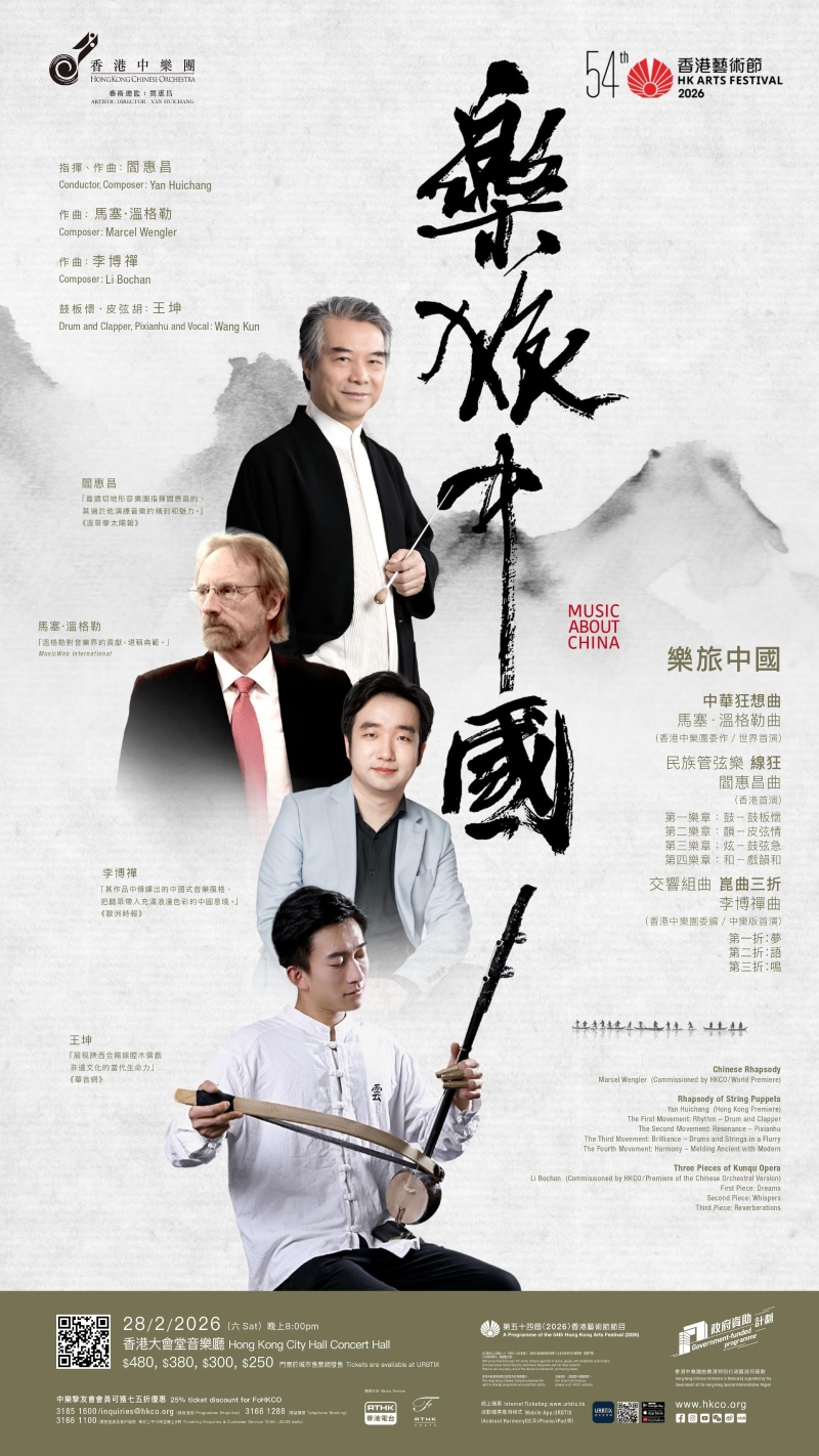 今年音樂會由香港中樂團藝術總監兼終身指揮閻惠昌策劃。 “樂旅中國”系列自2007年創辦至今已邁入第十五個年頭,成為香港藝術節中的常設品牌之一。多年來,香港中樂團與多位中外作曲家合作,推動跨文化音樂創作,讓中樂的聲音在國際舞台綻放。閻惠昌表示,這個系列的宗旨是建立文化對話的平台,讓不同地域與文化背景的音樂家以中樂為橋樑,重新演繹中國音樂的核心精神。今年匯聚三位風格鮮明的作曲家,共同為“樂旅中國”書寫新的篇章。 音樂會將由盧森堡作曲家馬塞・溫格勒(Marcel Wengler)創作的《中華狂想曲》揭開序幕。溫格勒與香港中樂團有長期合作關係,早於二十年前已共同推動推展中樂的國際化發展,亦一直致力推動音樂人才培育。新作歷經五年的構思與創作,作品以“狂想”為題,藉自由而靈動的旋律線條,在節奏變化與音色層次之間構築中西對話。 《崑曲三折》出自青年作曲家李博禪之手。作品改編自他為中央芭蕾舞團及上海音樂學院聯合委約的交響組曲,靈感來自三段崑曲摺子戲。這次首度以中樂樂 團形式演出,李博禪在創作中巧妙結合西方交響樂章結構與中國戲曲的節奏語感與敘事邏輯,讓崑曲的古典雅韻以新的形式被重新詮釋。 另一部作品《線狂》由閻惠昌於2023年創作,靈感源自陝西合陽縣獨有的提線木偶戲曲“線腔”。閻惠昌表示,希望透過現代中樂的樂隊編制,讓“線腔”這一傳統藝種在當代舞台上獲得新的活力,讓民間藝術能夠在新的時代被理解與欣賞。今次特邀陝西線腔木偶劇團的演奏家王坤來港演出,他將在舞台上以一人之力演奏皮弦胡、鼓板懷等七種傳統樂器,並兼具戲中人物的道白與唱腔,展現極高的藝術造詣及戲曲功底。 【編輯:洪少葵】