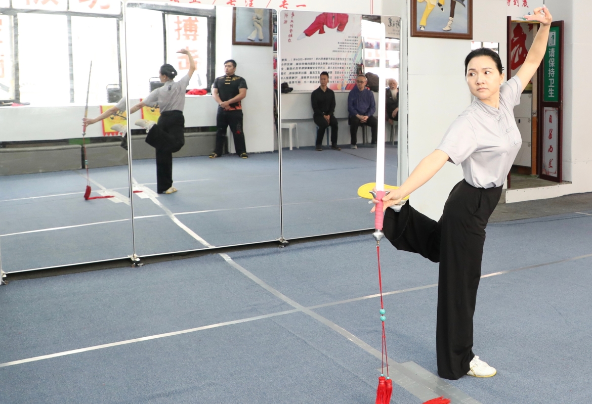 自然門龍女武術館學員們展示了紮實的基本功。 武藝切磋 傳統與現代的碰撞 交流會上,雙方各顯身手,精彩紛呈:深圳市自然門龍女武術館學員們展示了紮實的基本功;駐館教練庹樂意演練刀法,龍乃菁館長則親身示範長穗劍。