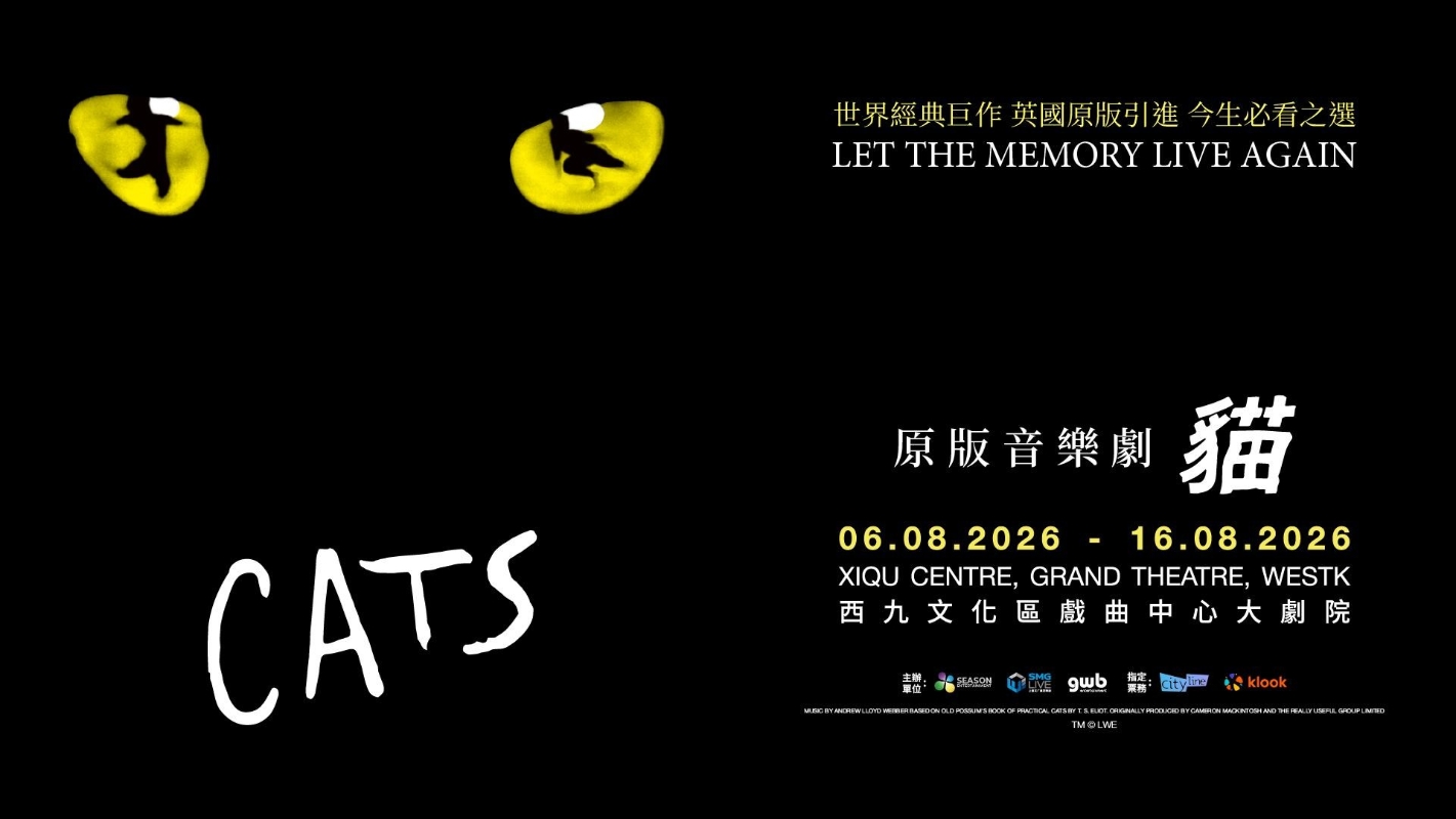 香港新聞網3月30日電 經典音樂劇傑作——安德魯·萊特·韋伯(Andrew Lloyd Webber)之《CATS》(貓),將於今年夏季來香港公演。這齣世界級製作將於8月6日起,於西九文化區戲曲中心大劇院上演,演出時間為逢星期二至星期日。3月17日起Klook獨家優先訂票及3月26日起公開發售。