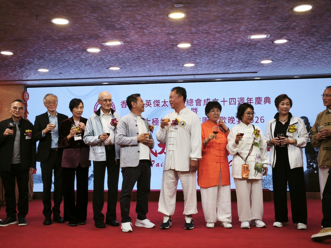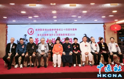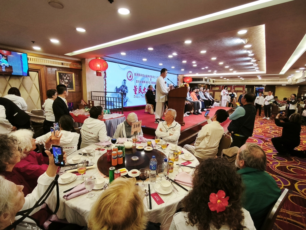 香港新聞網3月30日電 香港董英傑太極拳總會成立十四週年慶典暨董氏太極拳海外交流團晚宴日前在香港熱鬧舉行,香港董英傑太極拳總會創會會長董鄭小芬、來自美國的董氏第三代傳人董增辰、董白燕、董氏第四代傳人董大德、香港董英傑太極拳總會永遠會長嚴景初、黃巧兒、該會榮譽會長何永棠及主禮嘉賓施永青、香港美術家協會主席林天行、武術家蔡長慶等出席主禮。來自世界各地包括歐美、東南亞和兩岸三地的董氏太極拳傳人濟濟一堂,席間舉行武術表演,節目精彩紛呈。