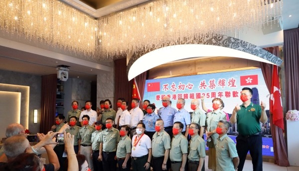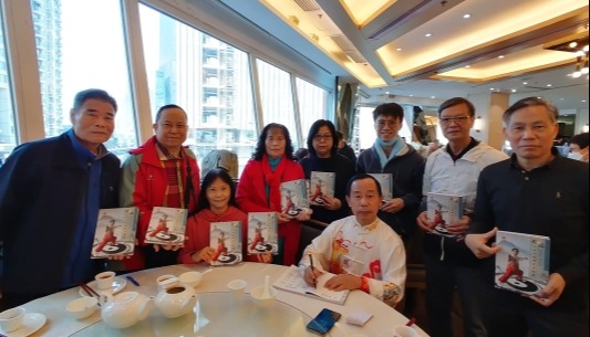 香港董英傑太極拳總會創會會長董鄭小芬(右四)、董氏第四代傳人董大德(右五)等主持祝酒儀式。
