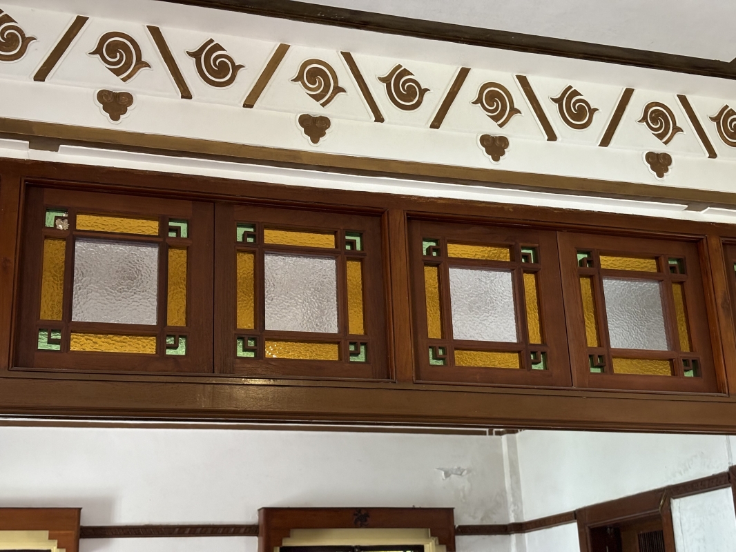 進入主樓之內,天花上的金漆灰塑橫樑令人眼前一亮,既加強樓板承載力,同時帶來華麗的視覺效果。地面鋪設雲石地磚、木地板,以及由馬賽克嵌砌而成的精美圖案。窗戶配有彩色玻璃、花崗石窗框和中式圖案的金屬窗芯,每一處皆有細節。導賞員介紹,大宅內分別設有中式和西式飯廳,還有宴客用的紫檀廳,並設有防範森嚴的夾萬房,在住宅中實屬罕見。
