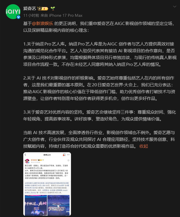 聲明。圖源:“愛奇藝”微博賬號截圖 聲明指出,藝人入駐僅表示其有意願接洽AI影視項目,是否參演及以何種形式參演,仍需針對具體項目單獨洽談並授權,流程與傳統真人影視合作一致。 20日,在2026愛奇藝世界大會上,公司宣布已有超百位深度合作藝人簽約入駐納逗Pro藝人庫,並列舉馬蘇、成泰燊、曾舜晞、蔣龍、房主任等人。但因新浪娛樂在相關推送中誤@于和偉、張若昀、王楚然等未合作藝人,引發後者團隊緊急闢謠,稱未簽署任何AI授權文件。愛奇藝隨後轉發更正說明,並重申入庫需藝人主動同意。