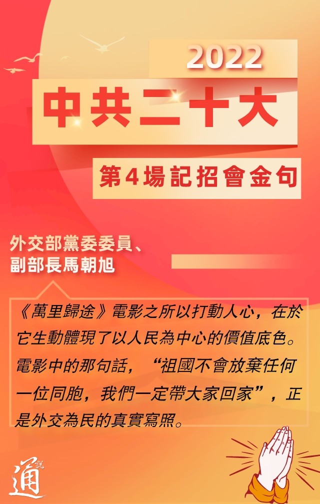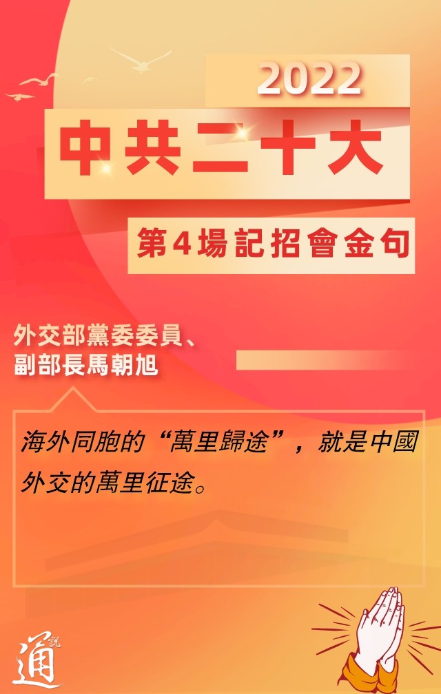 香港新聞網10月20日電 “選擇何種政治制度、何種發展道路,是各國政黨、各國人民自己的事”,“海外同胞的萬里歸途,就是中國外交的萬里征途”,“我們開展了針鋒相對、堅定有力的鬥爭,連續拿下台灣當局9個所謂‘邦交國’”,“祖國不會放棄任何一位同胞,我們一定帶大家回家......”