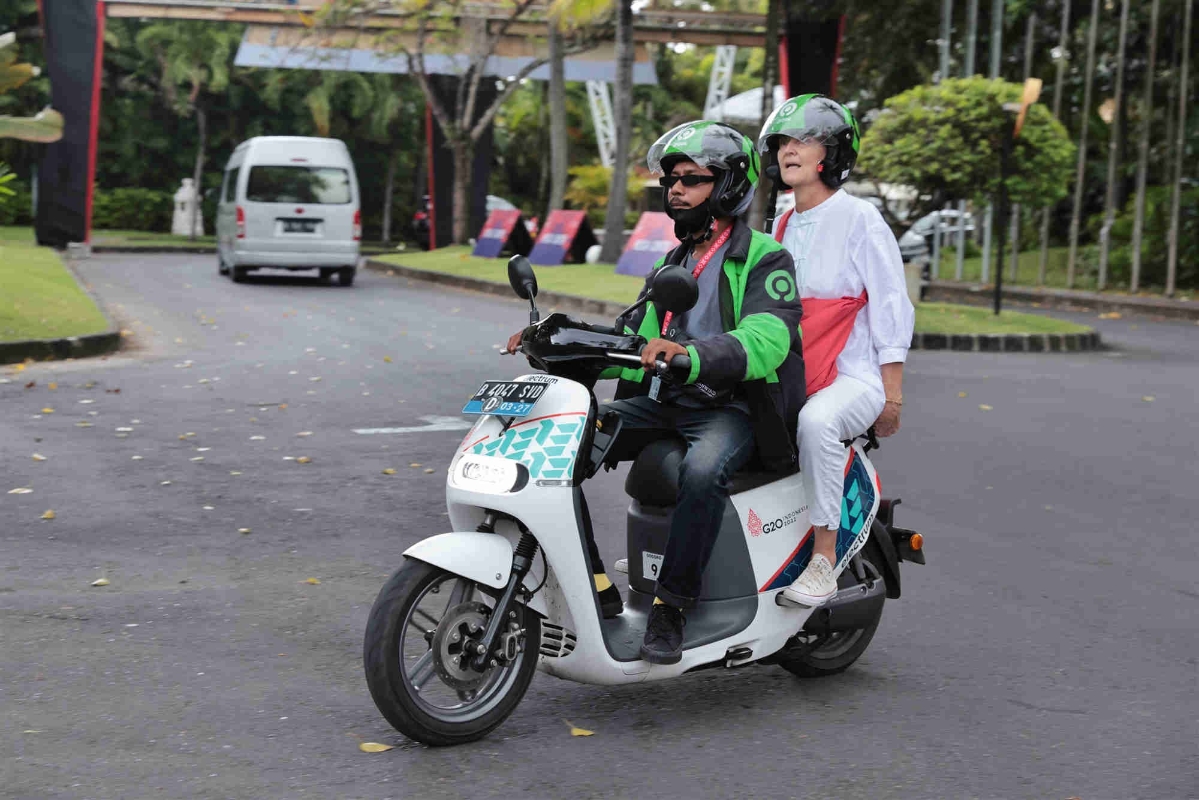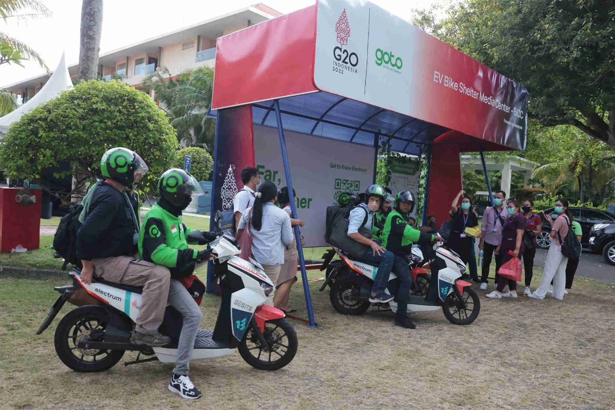 香港新聞網11月15日電 11月15日,二十國集團領導人峰會(G20)在印尼巴厘島揭幕。G20峰會管制區只限已註冊車輛進入,主辦方除了提供接駁車服務外,為方便記者採訪,特別安排了電動摩托車接駁,靈活穿梭於媒體中心和不同會場間,許多媒體對乘坐摩托車在會場穿梭感到新鮮,也有摩托車司機對於能參與到國際會議感到開心。