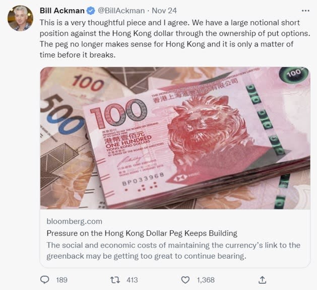 香港新聞網11月25日電 每逢港匯走低,都會吸引一批對沖基金企圖沽空港元。昨(24日)著名對衝基金經理Bill Ackman發文稱持有大量沽空港元倉位,令市場再度關注港元聯繫滙率制度。香港金管局則指對質疑聯繫匯率制度的個人觀點不予置評,並重申香港既不需要、也無意改變聯匯制度。 對沖基金Pershing Square Capital Management LP的創辦人Bill Ackman在Twitter發帖文指,持有大量沽空港元倉位,主要原因他認為聯繫匯率對香港不再具有意義,料港元與美元脫鈎只是時間問題。更附上《彭博》一篇題為“港元掛鈎壓力持續上昇(Pressure on the Hong Kong Dollar Peg Keeps Building)”報道。他稱,中國作為一個夠強大及獨立的主權國,為何仍有需要將港元及美元掛鈎,並指通常貨幣脫鈎之前,主權國都是聲稱永遠不會取消掛鈎。 Bill Ackman是著名基金經理,旗下基金規模龐大,管理資產規模達185億美元。正如他引述彭博報道指,港府要維持港元與美元掛鈎壓力近日持續上昇,因為美國聯儲局不停加息,資金普遍回流美國。