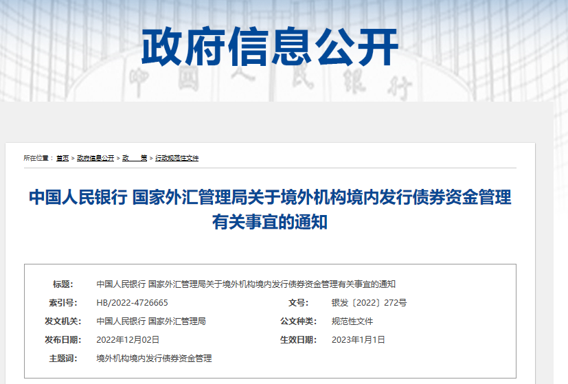 香港新聞網12月2日電 為進一步擴大金融市場雙向開放,中國人民銀行、國家外匯管理局聯合發佈《中國人民銀行 國家外匯管理局關於境外機構境內發行債券資金管理有關事宜的通知》(以下簡稱《通知》),完善境外機構境內發行債券(以下簡稱熊貓債)資金管理要求,進一步便利境外機構在境內債券市場融資。