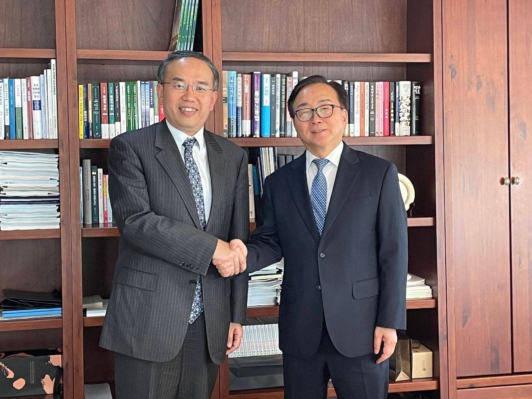 圖片來源:政府新聞網。圖示許正宇(左)禮節性拜會中國駐韓國大使邢海明(右) 許正宇同日亦與亞行副行長Ahmed Saeed會晤。他向Ahmed Saeed介紹香港交易及結算所有限公司去年推出的國際碳市場Core Climate交易平台。(完) 【編輯:崔靜雯】