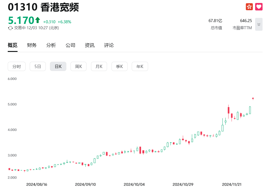 香港寬頻股價今年8月至今已漲超168%。(圖源:富途牛網) 消息面上,香港寬頻公佈,中國移動香港提出有條件自願全面要約,每股現金價5.23港元,較停牌前收報溢價7.61%;較8月止每股資產淨值1.95港元溢價約168.56%。連同貸款票據要約以及受限制股份單位要約,最高代價約77.97億港元。 另外,董事會已收到I Squared Asia Advisors Pte Ltd.提出無約束力的初步意向,表示有意收購公司的100%已發行股份,倘落實進行,預期將透過其投資組合公司HGC Global Communications Limited完成收購。可能其他要約為獨立於11月20日公告所提述中國移動可能提出的現金收購要約。於公告日期,公司與ISquared Asia Advisors Pte Ltd.仍在討論該建議的條款(包括價格)。 (完) 【編輯:錢林霞】
