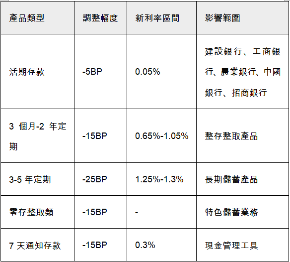 香港中通社圖片 5月20日起,中國四大國有銀行與招行同步下調人民幣存款利率,一年期定存利率正式跌破1%心理關口。本次調整涉及活期、定期、通知存款等全品類產品,三年期以上存款降幅最大達25個基點。 統一調整概況表