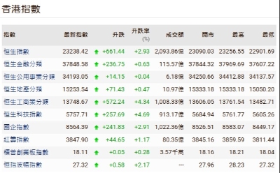 香港中通社圖片 恆生科技指數報5606點,升21點或0.4%。恆生國企指數升35點或0.4%,報9075點。CEC國際控股升259.3%,為當日升幅最大的股份;中天湖南集團跌41.4%,為當日跌幅最大股。 活躍重磅股表現個別發展,美團收129港元,跌1.4%;建行收8.27港元,跌1.2%;騰訊收526港元,升0.9%;小米集團收57.95港元,升0.3%;平安收53.5港元,升0.2%;阿里巴巴收118港元,升0.1%。 受到北京市傳燃油車徹底禁入網約平台、比亞迪第1300萬輛新能源汽車下線等多個利好消息影響,比亞迪22日收134.2港元,升逾5%。 致富證券市務總監郭思治向中通社記者分析,大市正處續尋頂趨勢中,在買盤主導下,估計整個大市仍會進一步上尋月內及年內之新高。(完) 【編輯:彭玉婷】
