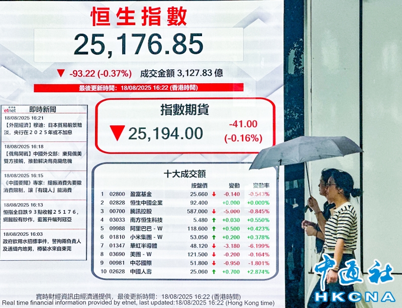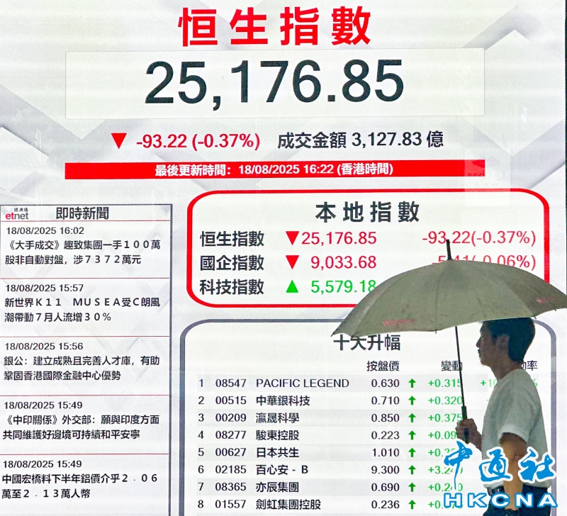 •   8月18日,截至收盤,香港恒生指數跌93.22點,跌幅0.37%,報25176.85點,主板全天成交3127.83億港元。(香港中通社記者 曹文毓攝) 香港中通社圖片