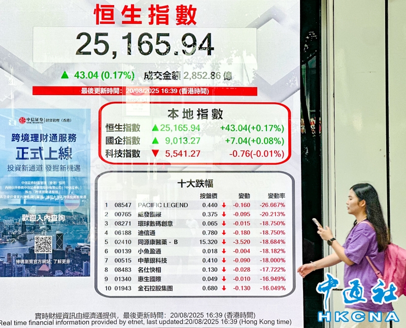 •   8月20日,截至收盤,香港恒生指數漲43.04點,漲幅0.17%,報25165.94點,主板全天成交2852.86億港元。(香港中通社記者 曹文毓攝) 香港中通社圖片