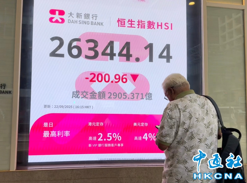 •   9月22日,香港恆生指數收報26344.14點,跌200點,主板成交額逾2905億港元。(香港中通社記者 徐文峰攝) 香港中通社圖片