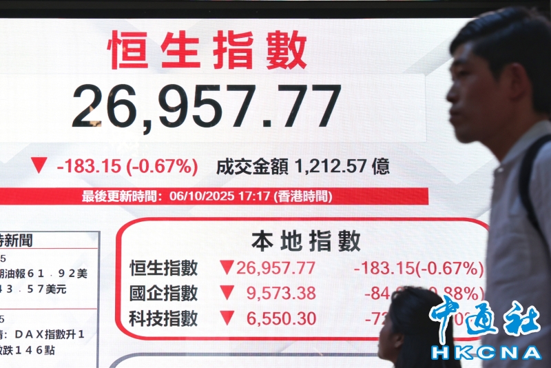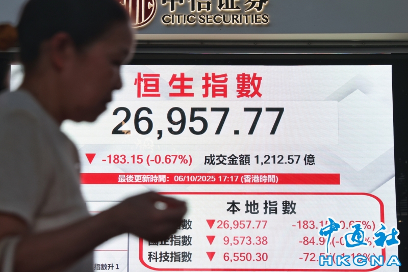 •   10月6日,截至收盤,香港恒生指數跌183.15點,跌幅0.67%,報26957.77點,主板全天成交1212.57億港元。(香港中通社記者  謝光磊 攝) 香港中通社圖片