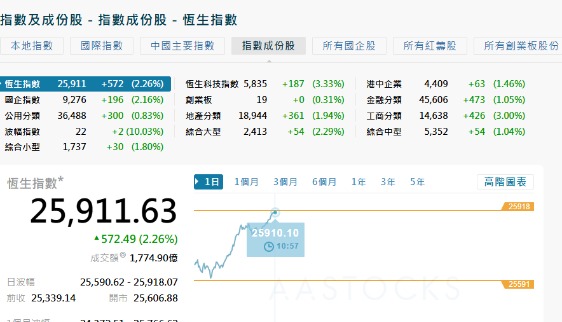 恒指高開350點,報26958點後升幅擴大。截至早上10時10分左右,恒指報27118點,升509點或1.92%。