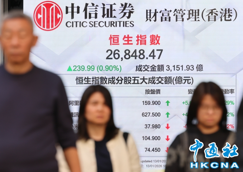 •   1月13日,截至收盤,香港恆生指數漲239.99點,漲幅0.90%,報26848.47點,主板全天成交3151.93億港元。(香港中通社記者 鄧梓傑 攝) 香港中通社圖片