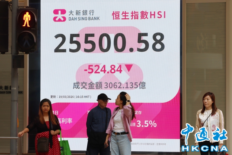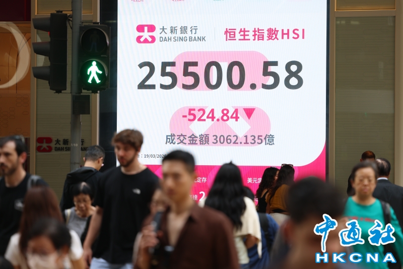 •   3月19日,截至收盤,香港恆生指數跌524.84點,跌幅2.02%,報25500.58點,主板全天成交3062.14億港元。(香港中通社記者 鄧梓傑 攝) 香港中通社圖片