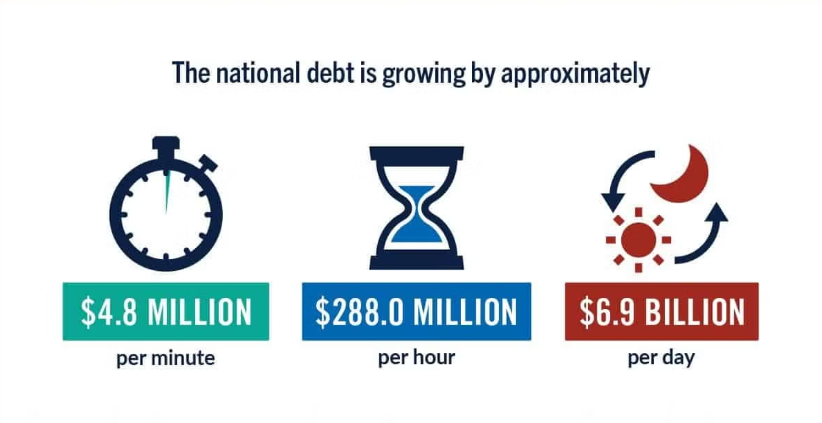 美國彼得·彼得森基金會官網圖片顯示,美國國債每分鐘增長480萬美元,每小時增長2.88億美元,每天增加69億美元。