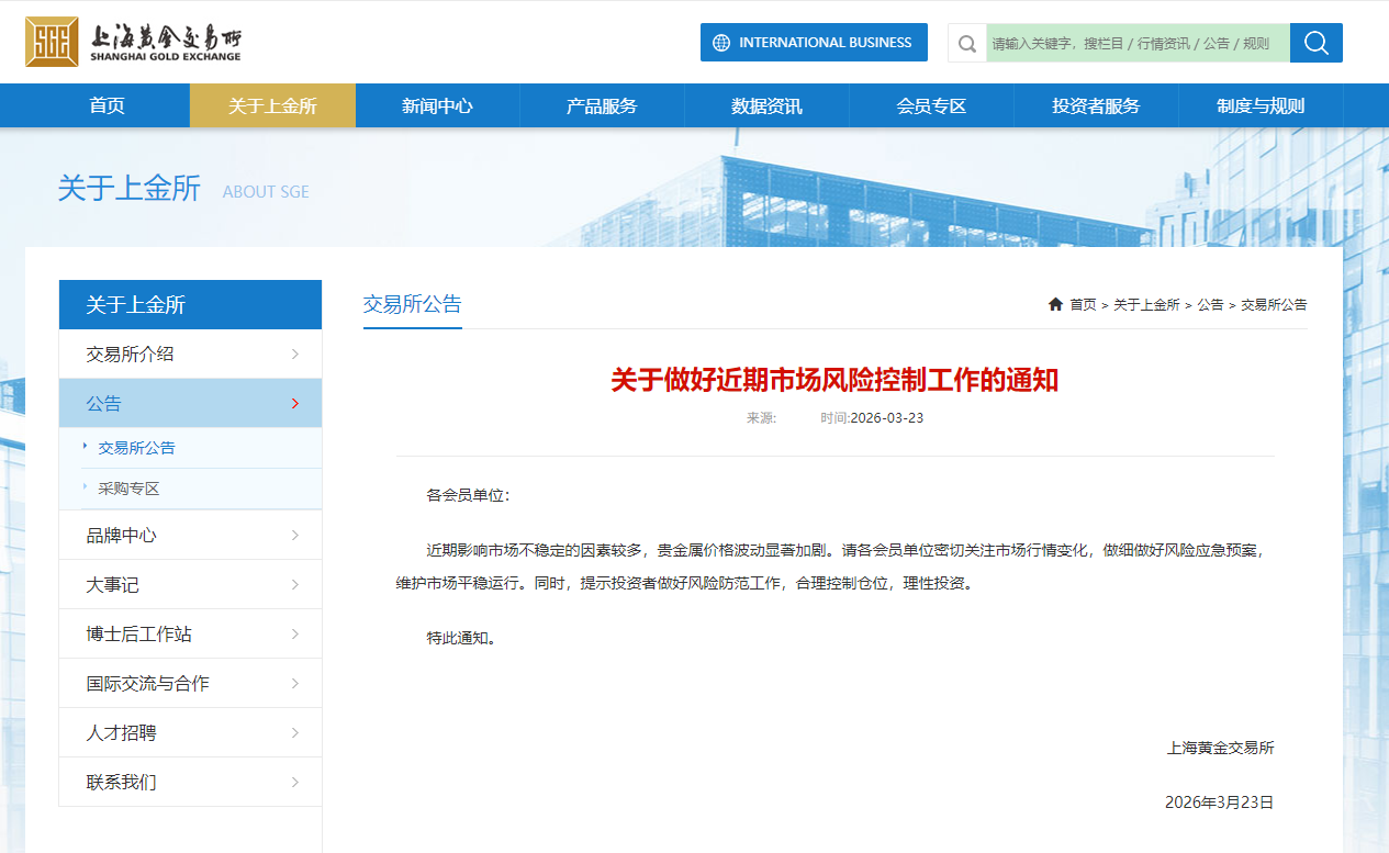 上海黃金交易所網頁截圖 綜合消息,23日金飾價格同步大幅下調。內地媒體報道稱,老廟黃金足金飾品報價從3月22日的每克1413元驟降至每克1363元,單日跌幅達50元,消費者購金成本明顯回落。 上金所緊急發布的《關於做好近期市場風險控制工作的通知》指,近期影響市場不穩定的因素較多,貴金屬價格波動顯著加劇,要求會員單位加強風險預案,並提醒投資者“合理控制倉位,理性投資”。