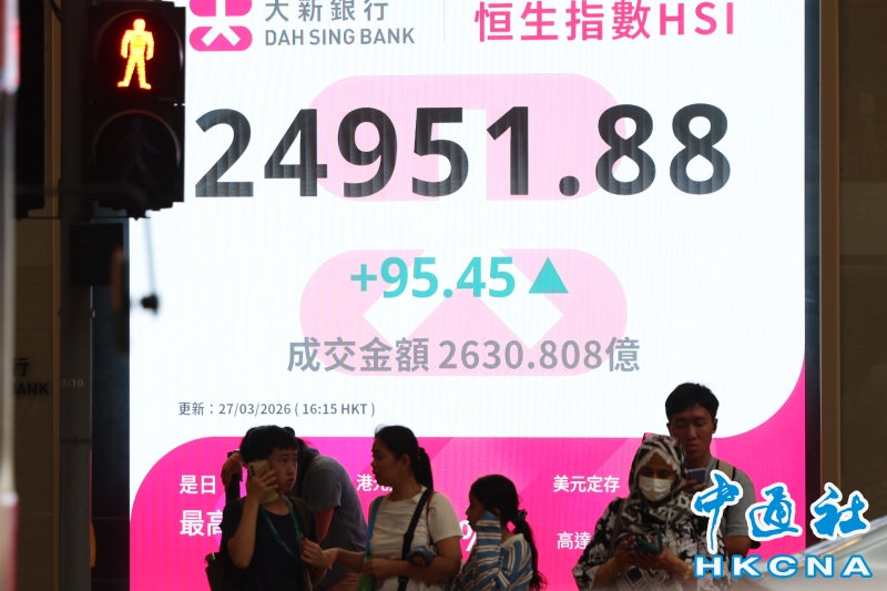 •   3月27日,截至收盤,香港恆生指數漲95.45點,漲幅0.38%,報24951.88點,主板全天成交2630.81億港元。(香港中通社記者 鄧梓傑 攝) 香港中通社圖片